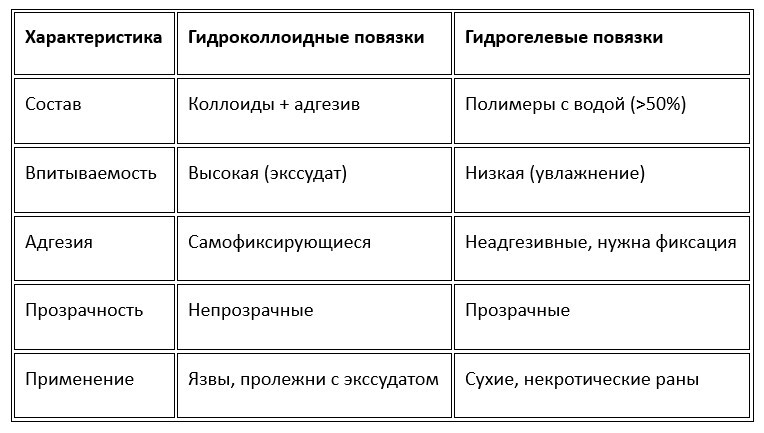 Гидроколлоидные лучше для умеренно мокнущих ран, гидрогелевые — для сухих.